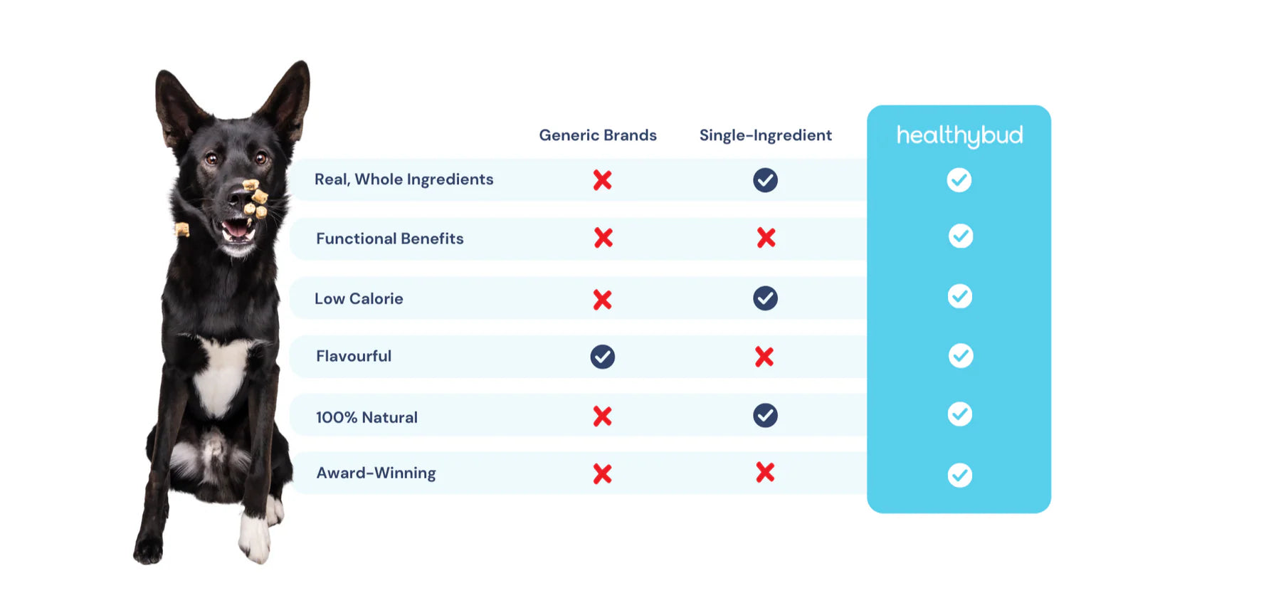 Healthybud’s Mini Trainers are made for maximum motivation with minimal ingredients. Low-calorie, big flavor, and gentle on sensitive tummies — they’re the reward your dog will actually work for.